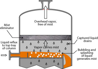 Kapalina zachycená na vláknech odtéká gravitačně. Zajišťují téměř úplné odstranění kapek o velikosti přibližně 3-5 mikronů. Při příliš vysoké rychlosti jsou kapičky kapaliny, které dopadají na povrch síta střiženy párou a zachyceny dříve, než mohou odtéct.