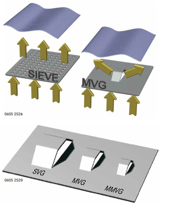 Menší patra nabízí díky menší tlakové ztrátě vyšší kapacitu než ty vetší. Můstky MVG poskytují vyšší kapacitu než standardní síťové patra při vyšší účinnosti a menším poklesu tlaku na jedno teoretické patro.