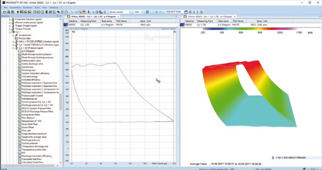 U pístových kompresorů poskytuje PROGNOST®-NT detailní analýzu mechanického i procesního stavu stroje. Systém zpracovává signály z různých senzorů a umožňuje například: