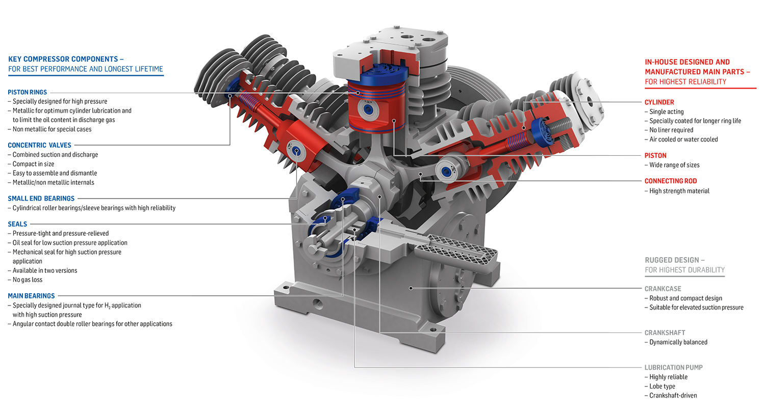 SHP (Standard High-Pressure) kompresory jsou standardizované pístové kompresory určené pro náročné aplikace s vysokými tlaky. Jsou navrženy jako kompaktní a spolehlivé kompresorové jednotky s vysokou účinností a jednoduchou instalací. Kompresory SHP se používají pro kompresi plynů, jako je vodík, helium, dusík, zemní plyn nebo syntézní plyn, a nacházejí uplatnění například v energetice, výrobě a skladování vodíku, průmyslových plynech, elektrolytických procesech, plnicích stanicích CNG či v chemickém průmyslu. Díky robustní konstrukci a osvědčeným komponentům zajišťují dlouhodobě spolehlivý a bezpečný provoz.