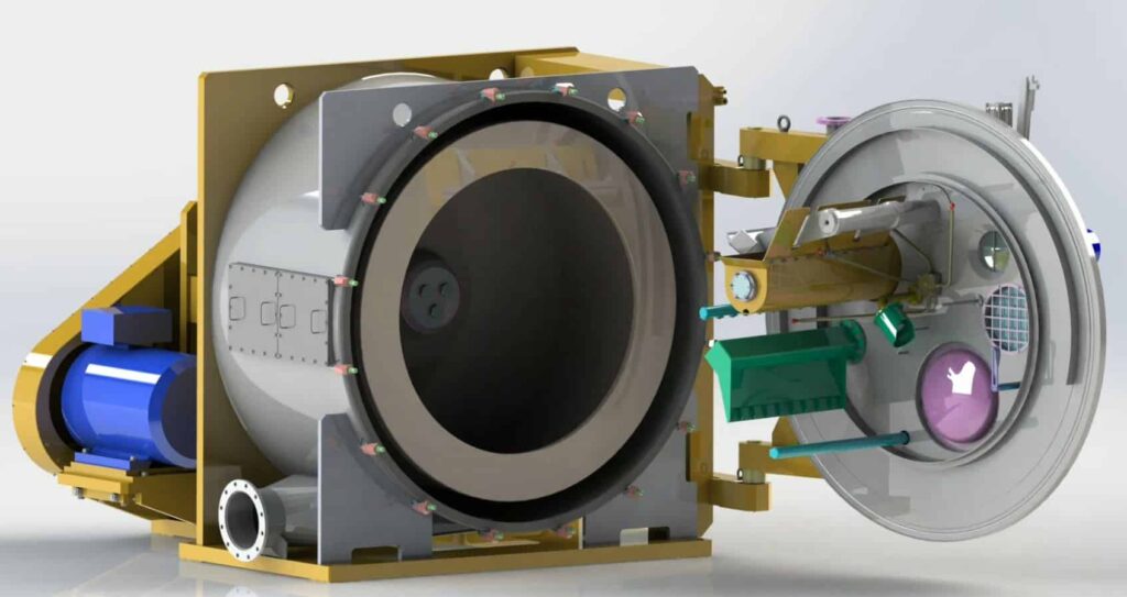 Horizontální filtr pro záchyt vláken z procesu výroby nitrocelulózy. Filtr lze umístit za odkyselovací odstředivku nebo refiner pro snížení obsahu vody, nebo pro přečištění „bílých vod“